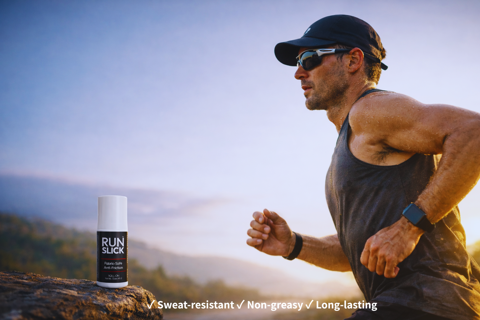 Run Slick is a fabric-safe performance roll-on designed to help reduce friction during running, hiking, and long efforts. It goes on clear, dries quickly, and feels lightweight on skin—so you can stay comfortable through miles, heat, and movement.